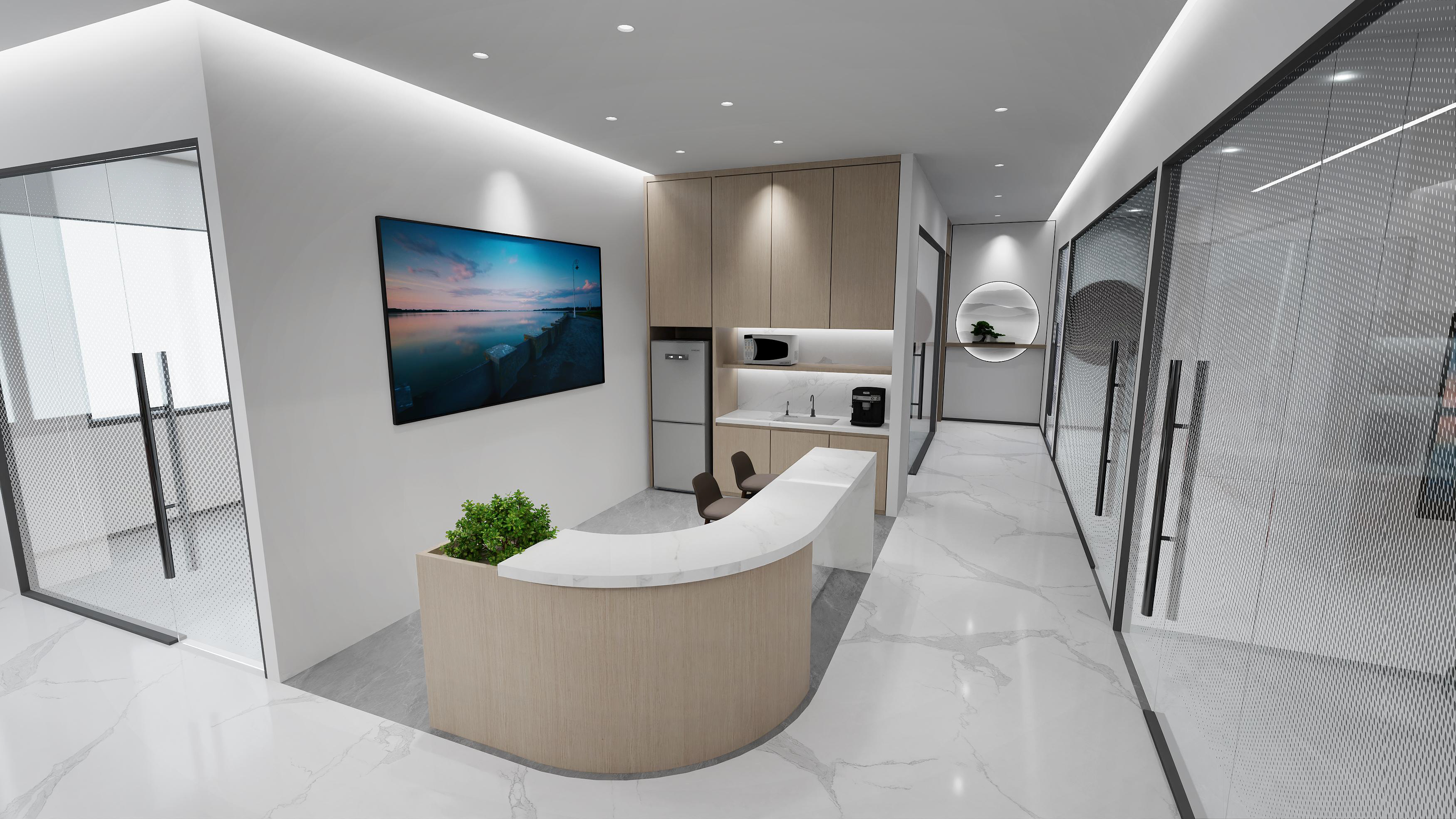 logo墻簡潔明了,節省空間,綠植和墻壁相互映襯,沉穩大氣。整體以灰色調為主,打造簡約風格的同時突出科技感。總經理辦公室中式家具以及其他裝飾物的搭配使用,突顯公司品味。