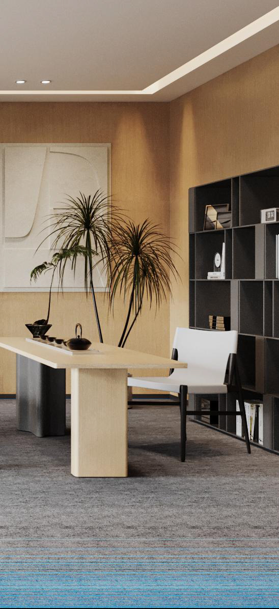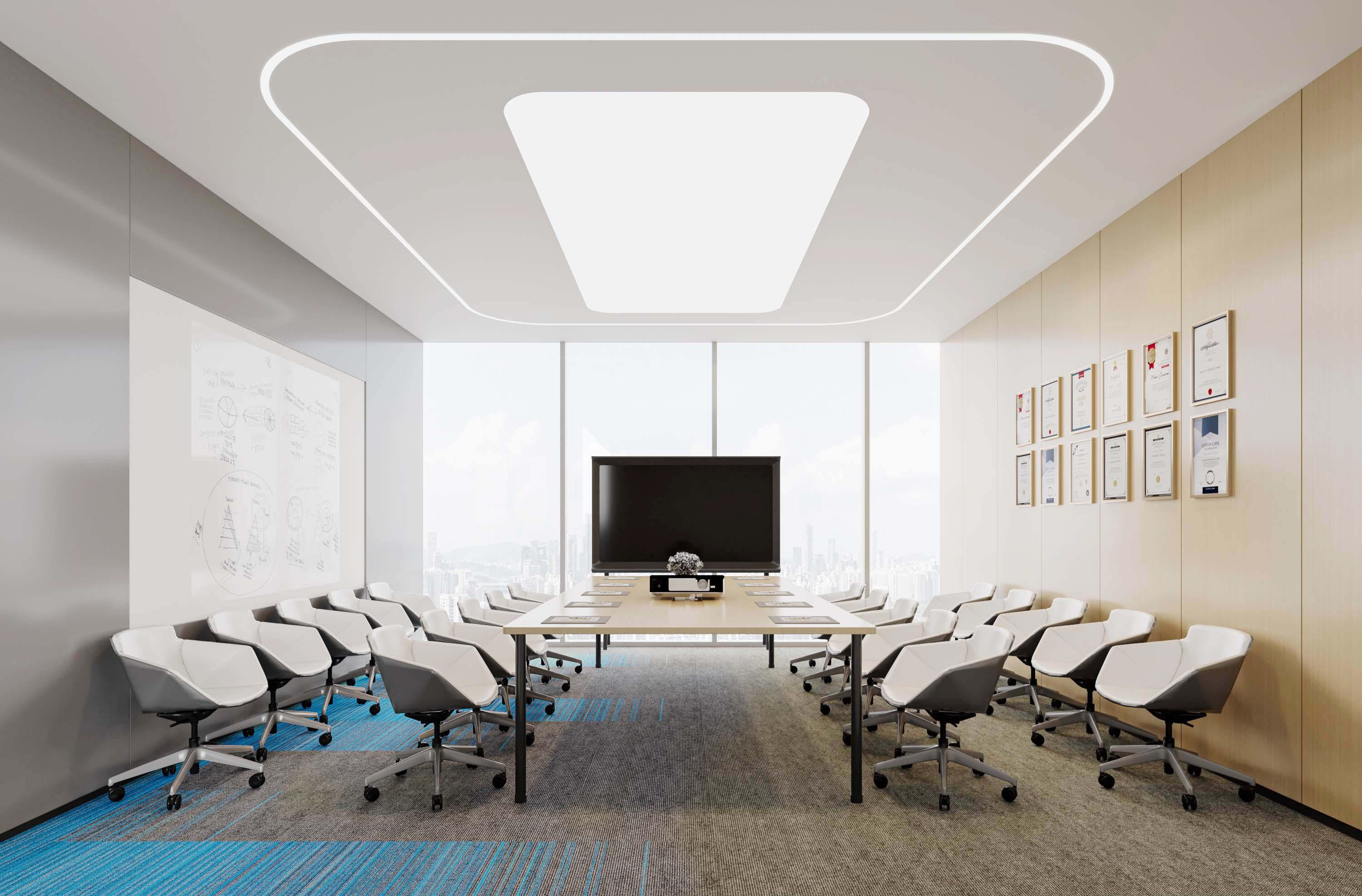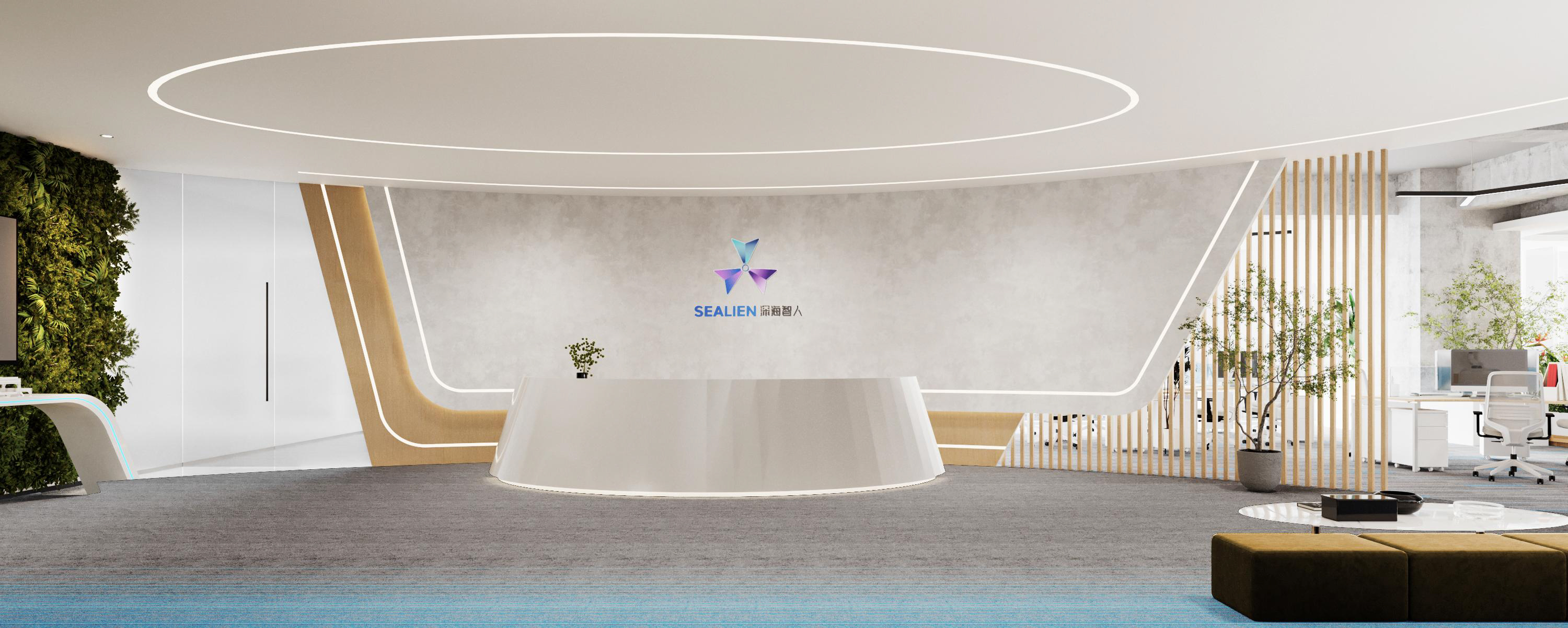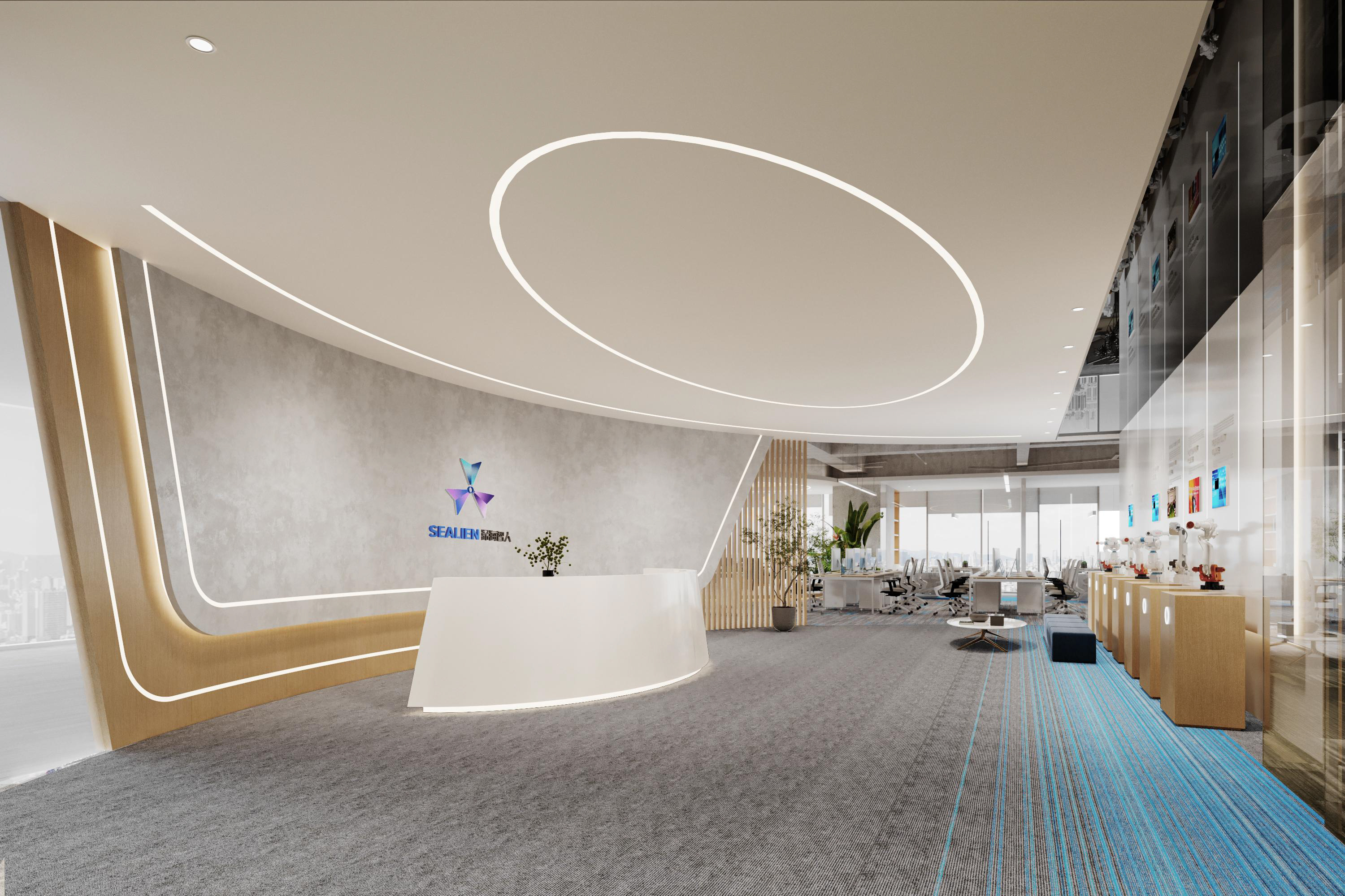 整體選擇以灰色作為主色調,營造簡約、現代的感覺,藍色條紋的設計強調了科技感。照明上使用led燈,根據不同的色溫營造氛圍。辦公空間采用開放式布局,減少隔斷,使空間更加開闊,綠植等元素為辦公空間增添自然色彩,帶來了生機。
