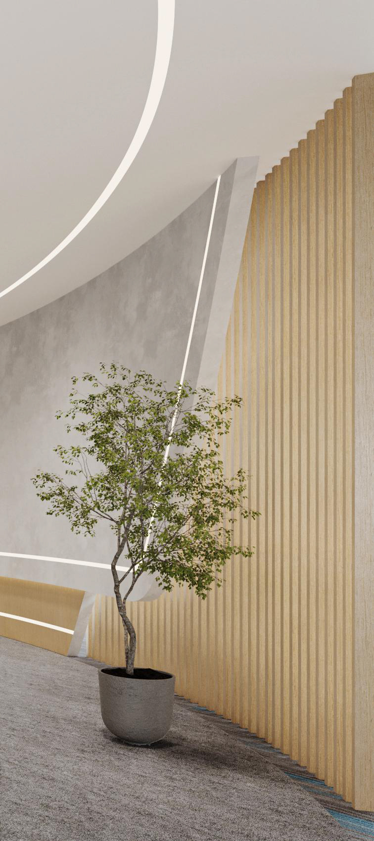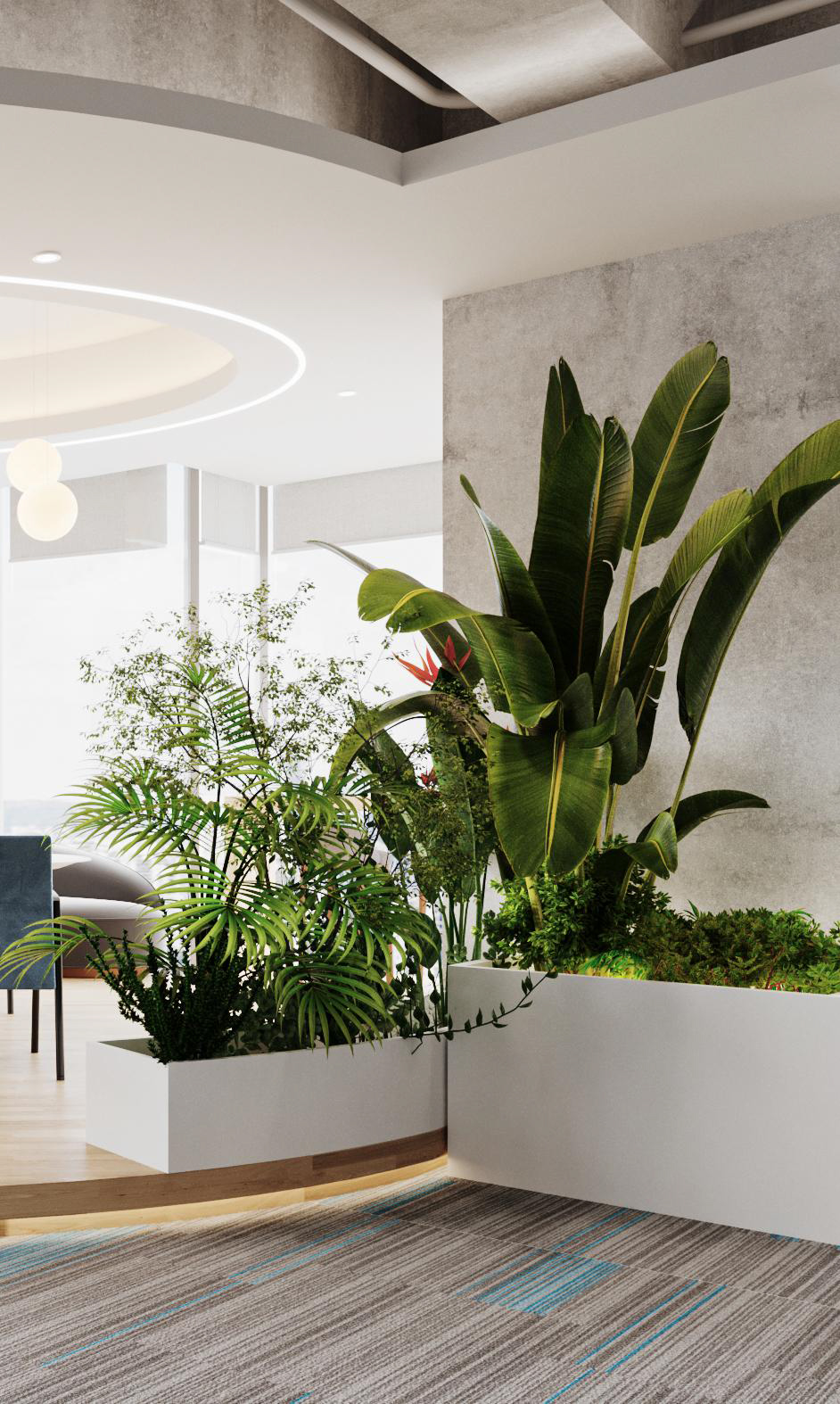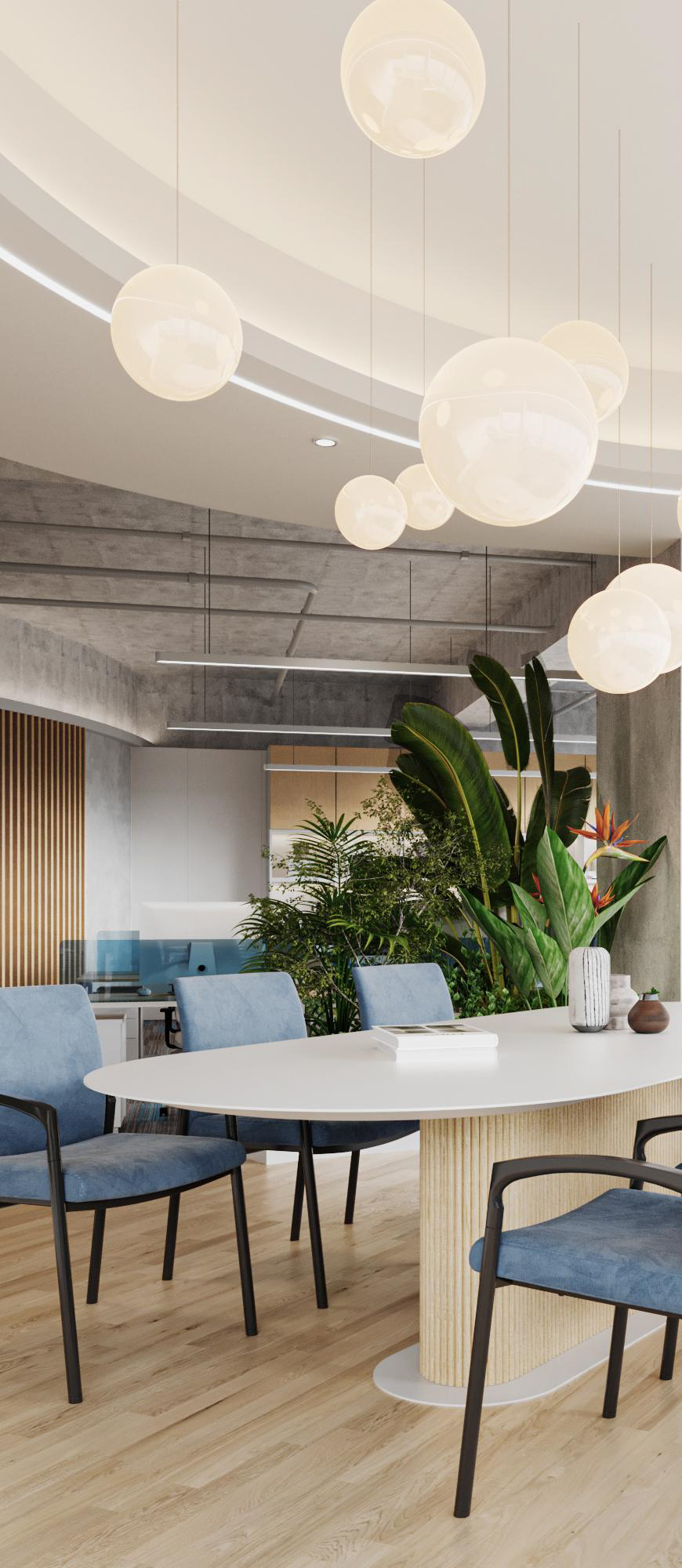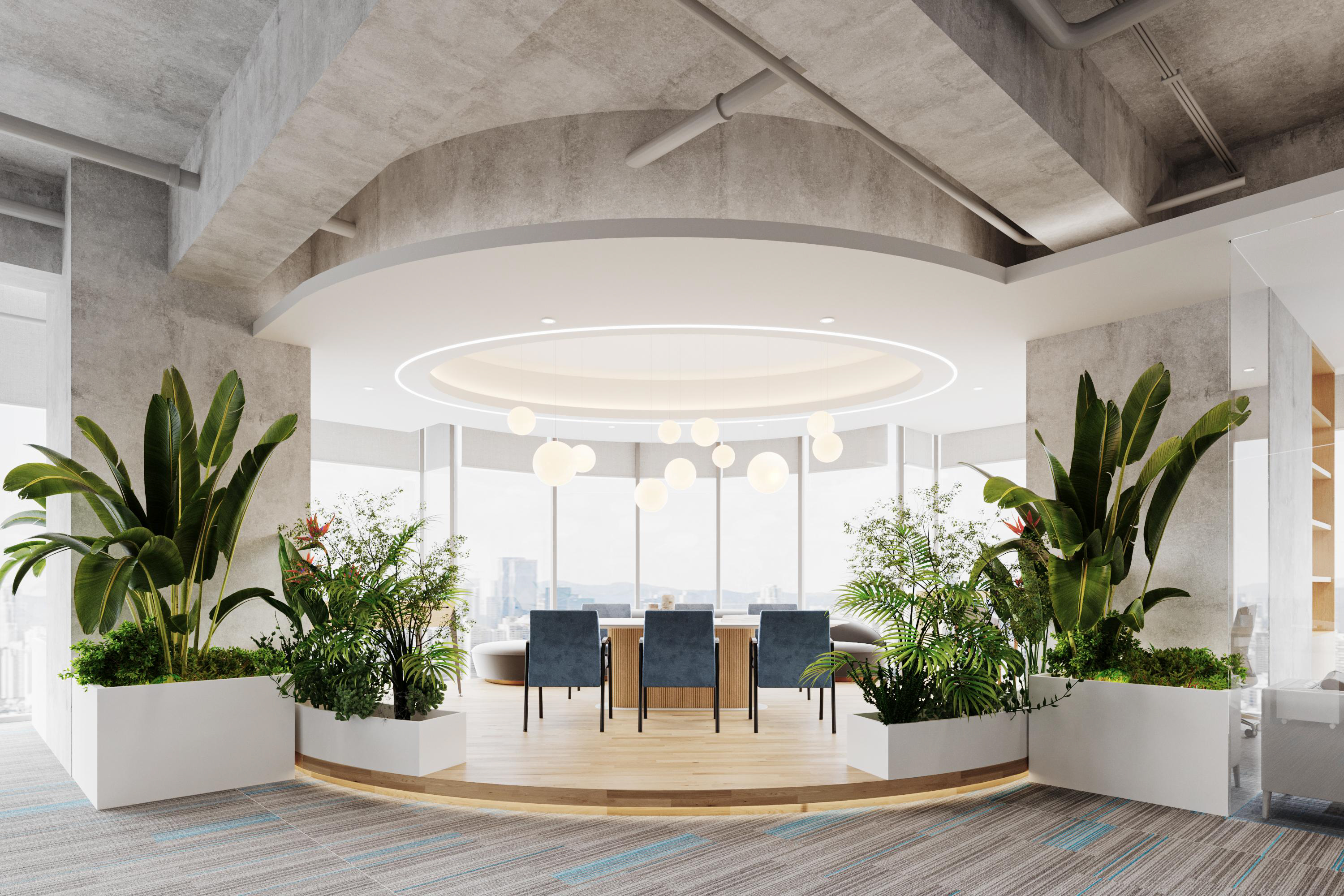 整體選擇以灰色作為主色調,營造簡約、現代的感覺,藍色條紋的設計強調了科技感。照明上使用led燈,根據不同的色溫營造氛圍。辦公空間采用開放式布局,減少隔斷,使空間更加開闊,綠植等元素為辦公空間增添自然色彩,帶來了生機。