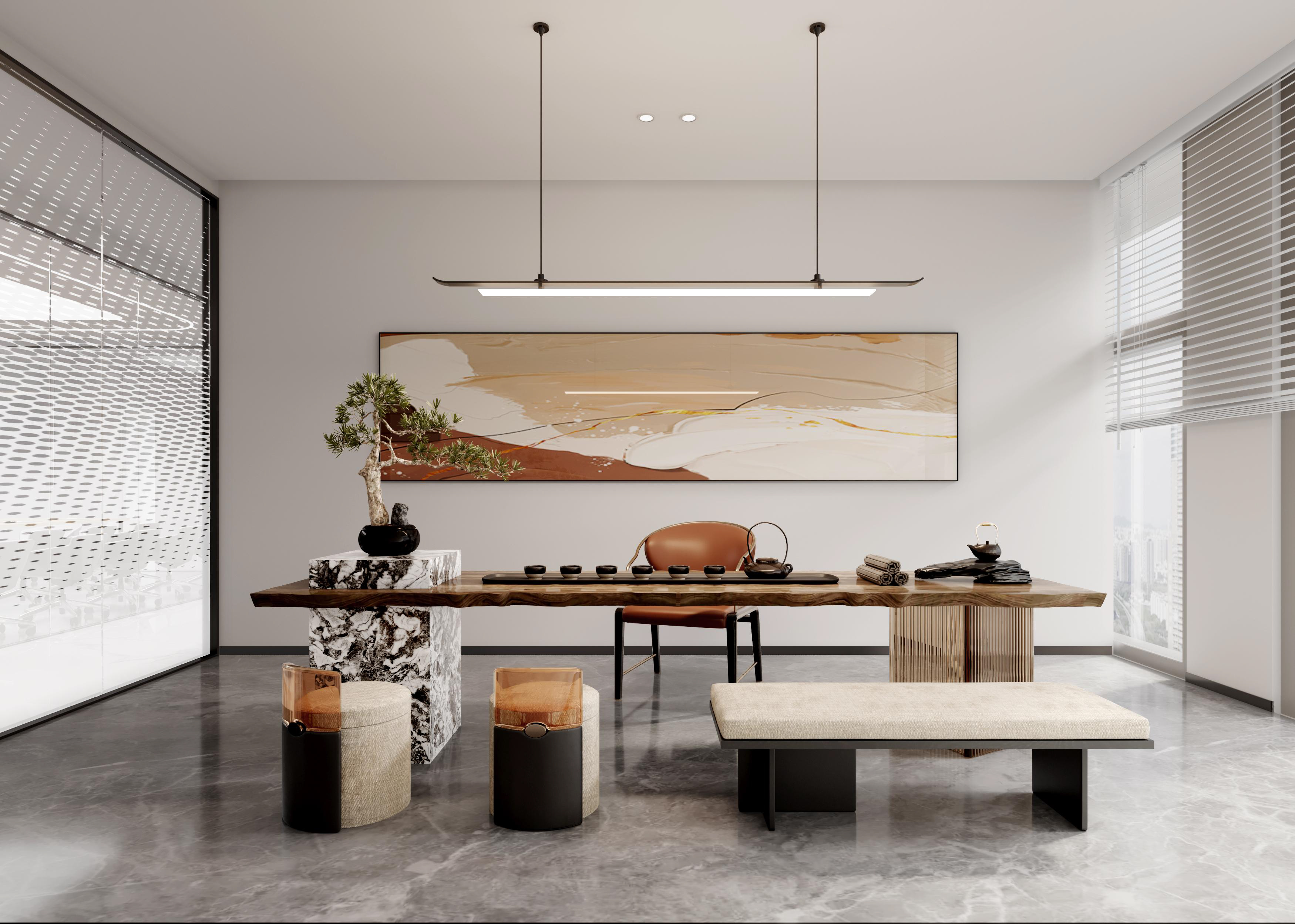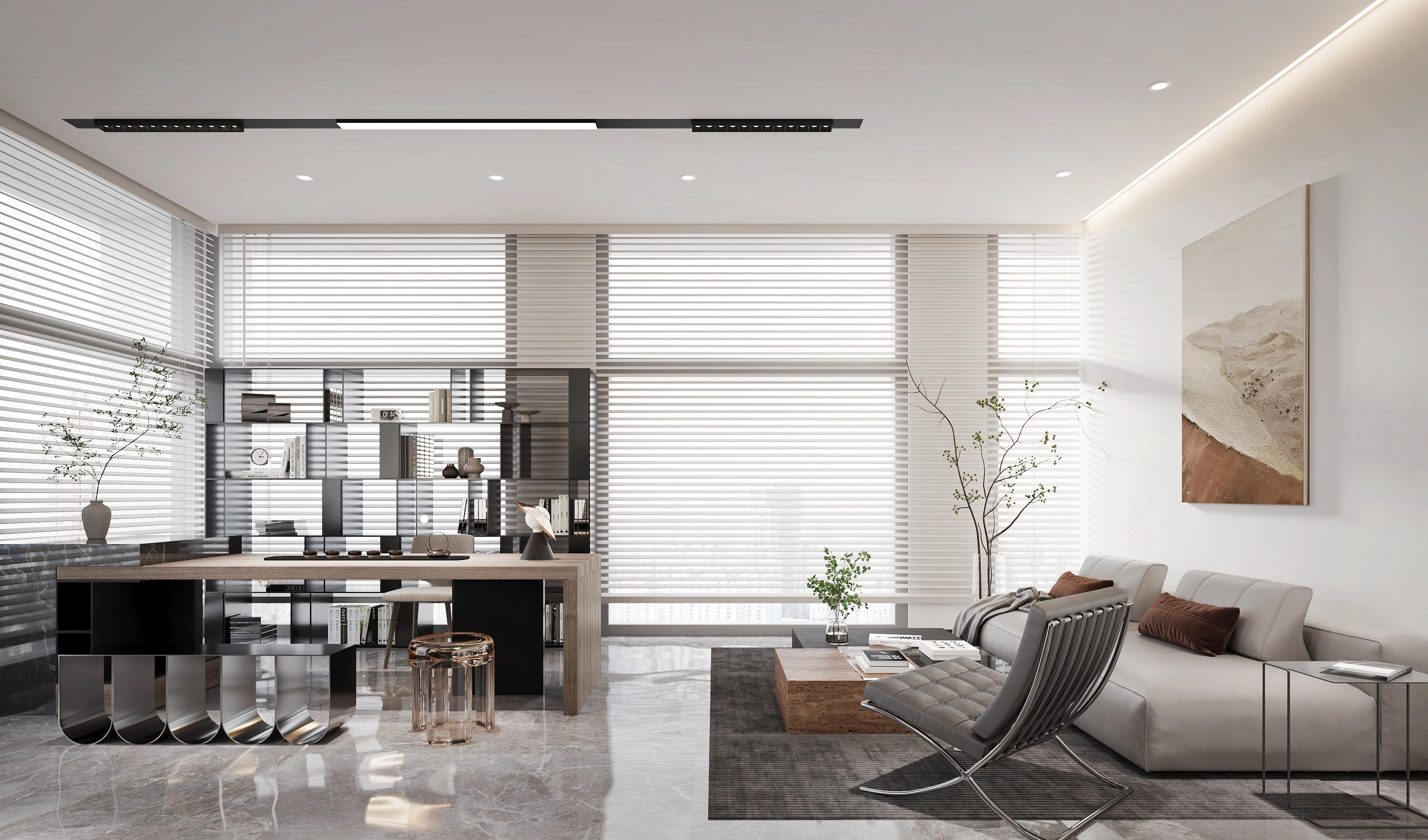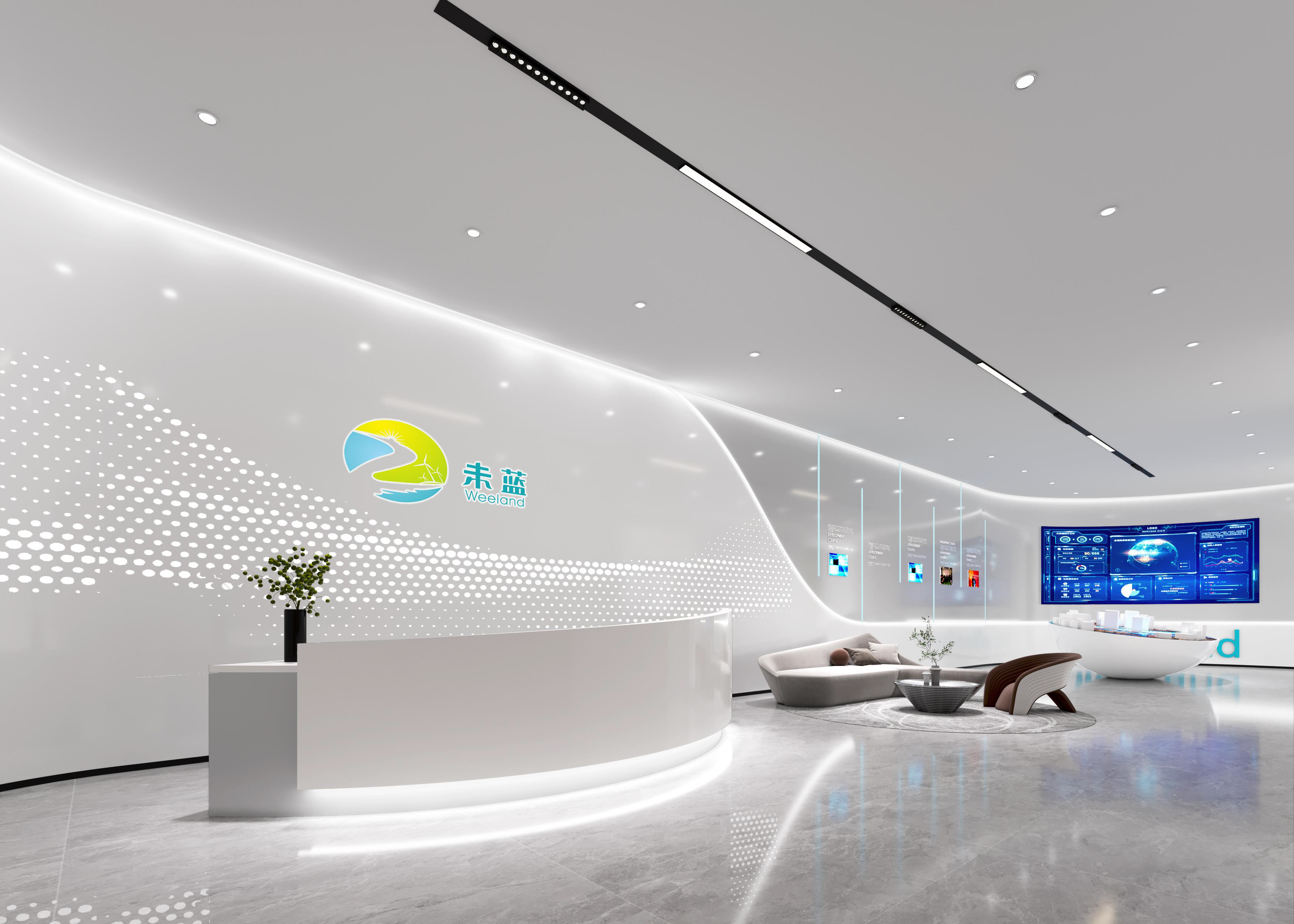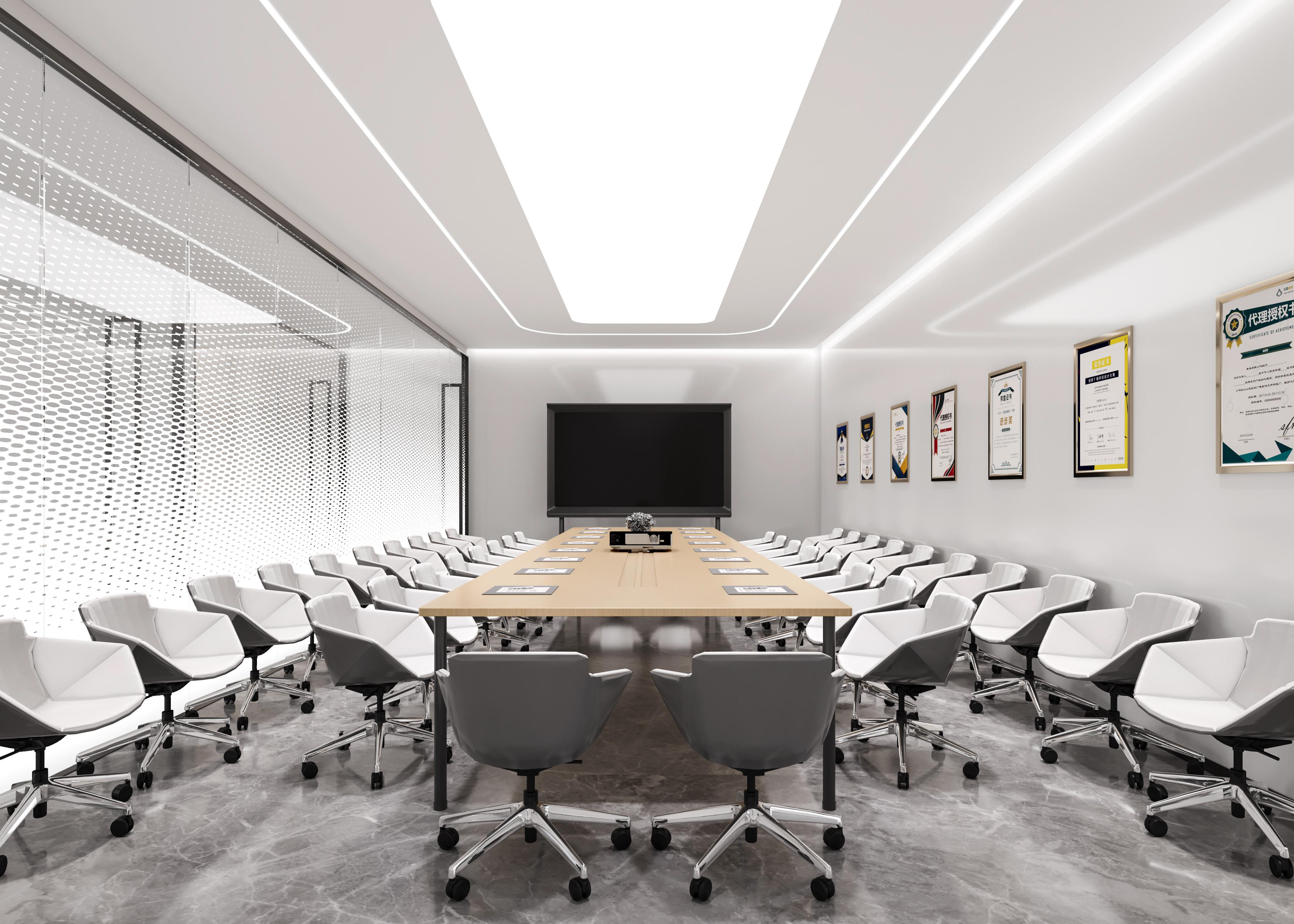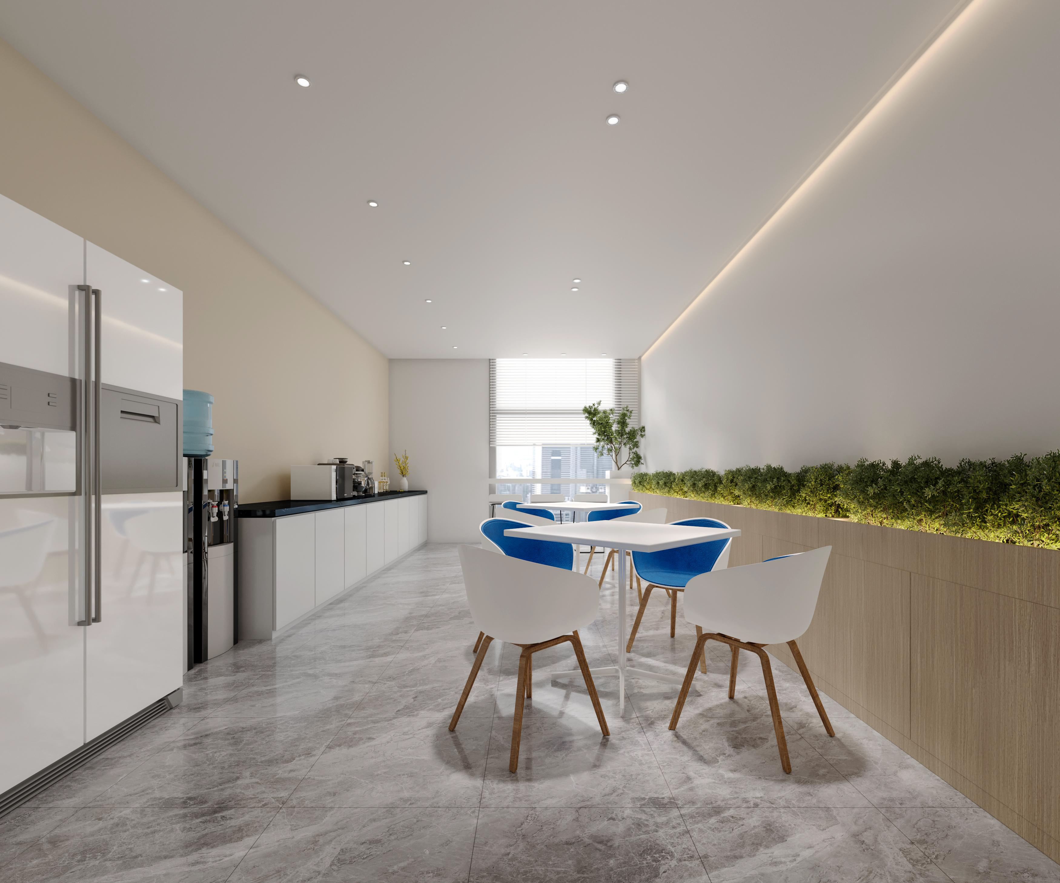 冷色為主色調,營造簡約、現代感,光點增加動態感,增添活力。隱藏式照明,減少視覺上的雜亂,空間看起來更加簡潔。開放式辦公室,使空間開闊,玻璃隔斷,增加了辦公空間的通透、明亮。