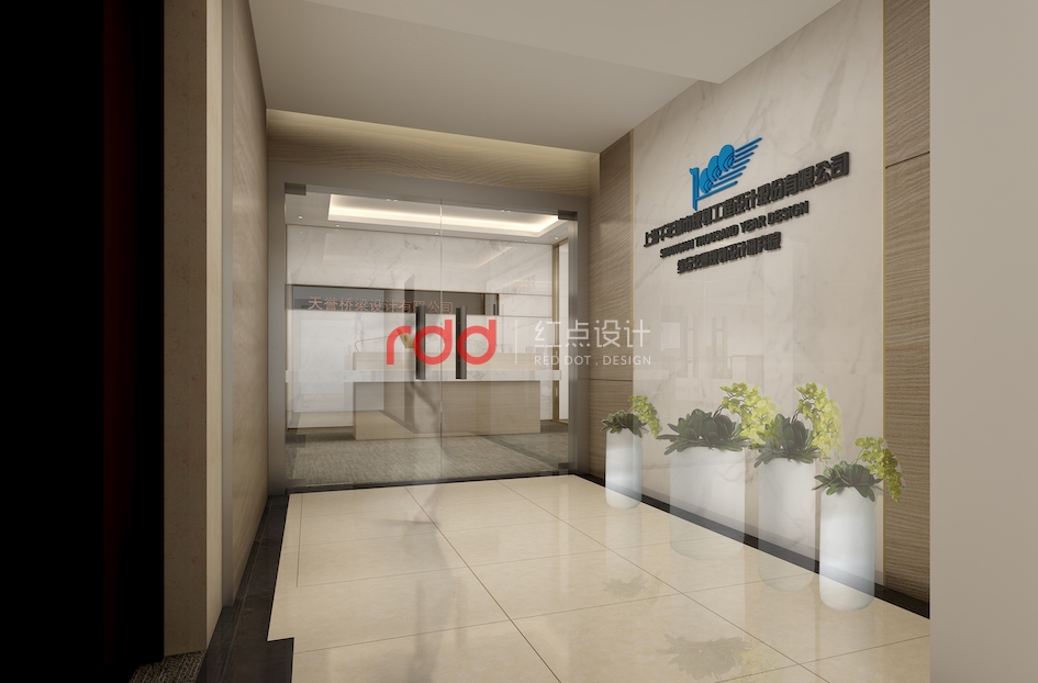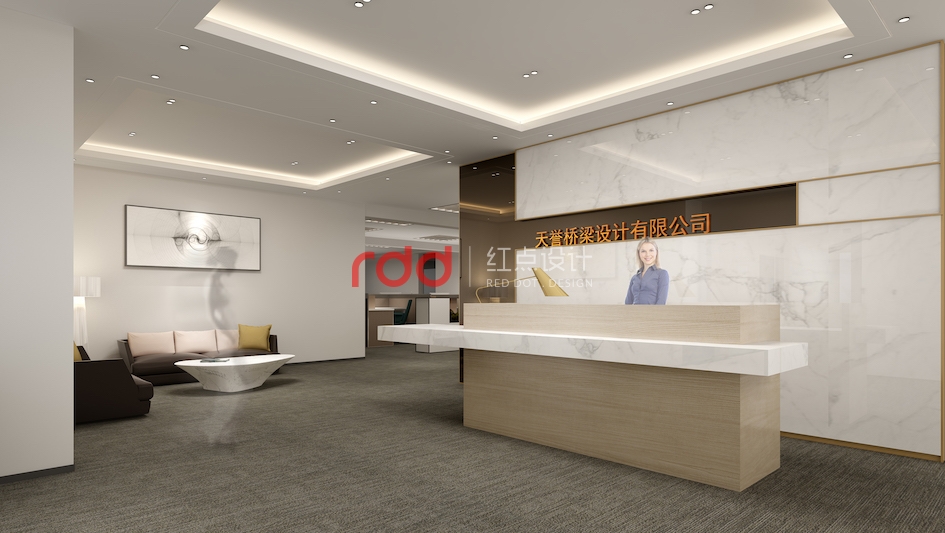 天譽橋梁設計公司是一家專注于橋梁設計的專業公司,結構沉穩大氣是橋梁的特點之一,因此在該公司的辦公室設計上,紅點裝飾設計的設計師運用爵士白大理石、玫瑰金與茶鏡的設計,讓整個前臺背景的沉穩多了幾分輕盈。