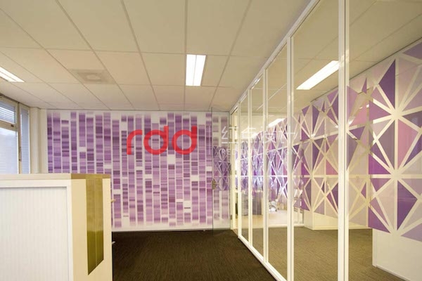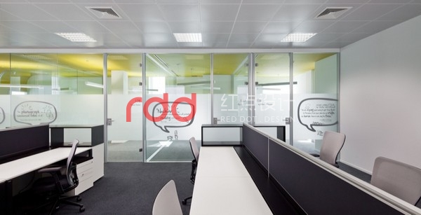 IT行業(yè)給人的印象是硬朗的,為了打破這樣的固定思維模式,紅點裝飾的設(shè)計師運用黃色及紫色比較柔和的色彩來改變空間的氛圍。線條交錯的白色鏤空隔斷圍合,形成相對獨立的空間。