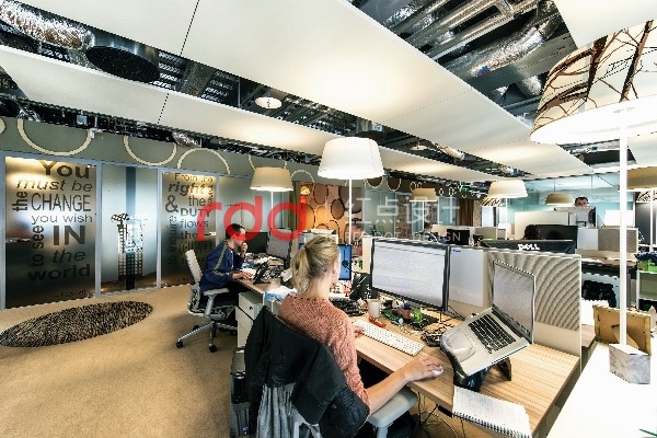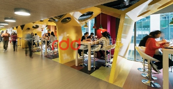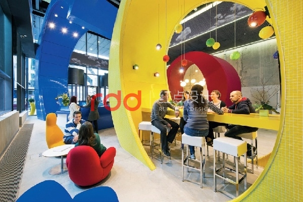 一樓入口大廳,將企業Logo「Google」植入其中,并化身為柜臺、接洽區、洽談區等。 建筑以透明玻璃為隔墻,從室外就能清楚看到Google的企業Logo與醒目的色彩。辦公空間以Open Office方式來呈現 舍棄過多隔間阻隔,改以開放式手法,讓員工能在充滿流動性的環境中工作,進而產生與空間之間的連結。