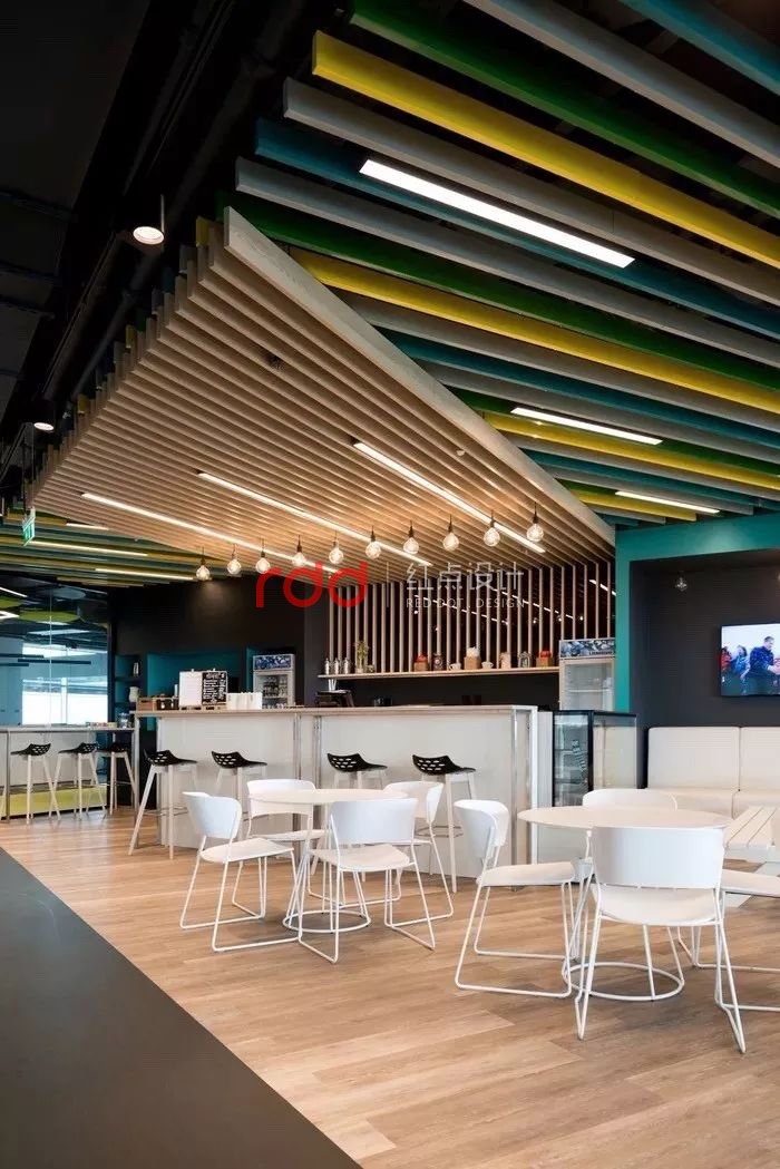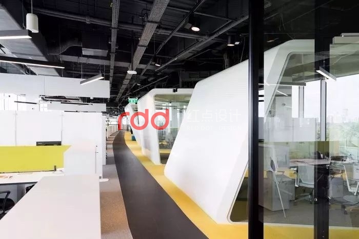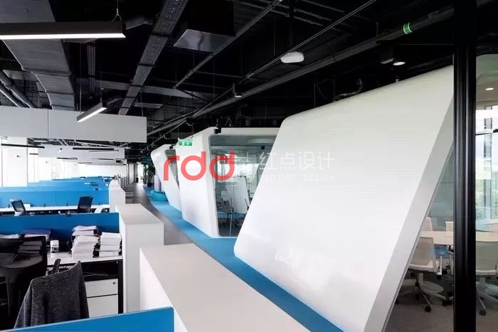 室內(nèi)設(shè)計(jì)呼應(yīng)阿迪達(dá)斯的標(biāo)志,在每一層的同一個(gè)地方都有白色會(huì)議室,從中庭看,就能形成阿迪達(dá)斯的經(jīng)典標(biāo)志。