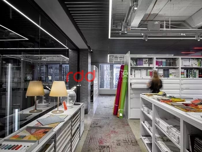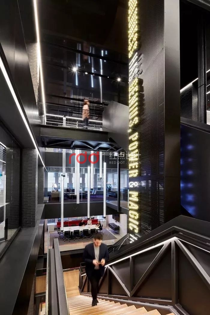 這間辦公室的空間充滿戲劇性,有一座五層相連的樓梯、驚人的燈光以及大量品牌細節(jié)。