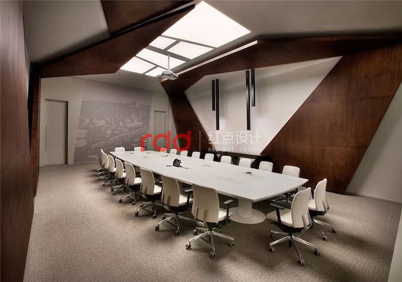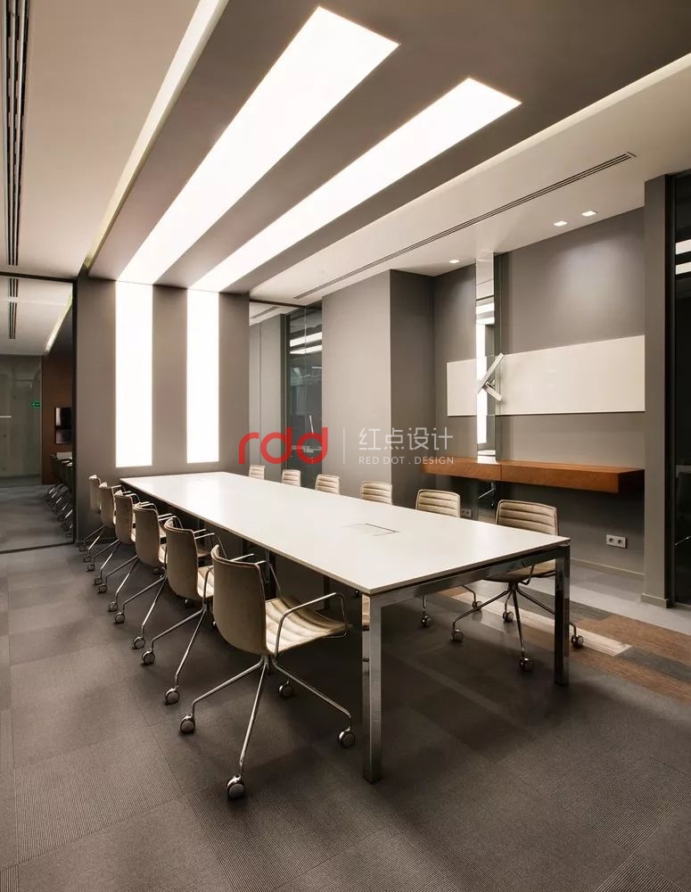 會(huì)議室的設(shè)計(jì)旨在充分激發(fā)員工一起學(xué)習(xí)與交流,制定戰(zhàn)略。空間的照明標(biāo)準(zhǔn)、聲學(xué)系統(tǒng)以及數(shù)字媒體系統(tǒng)參考了設(shè)計(jì)團(tuán)隊(duì)以往的辦公項(xiàng)目,以塑造專業(yè)性和正式感。