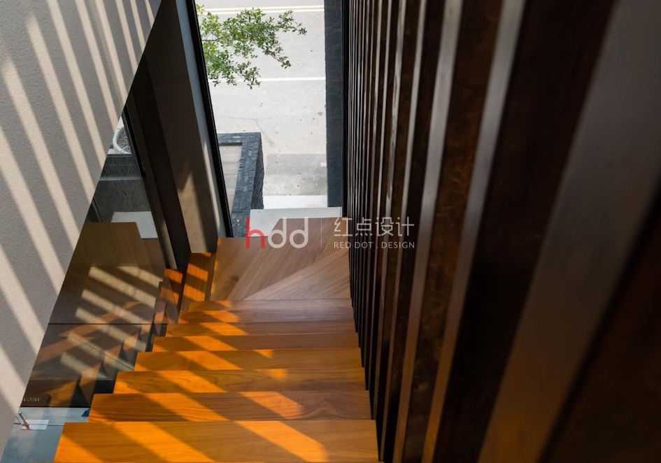 垂直設計樓梯串連 1 至 3 樓空間,讓刻板僵化的樓梯印象成為空間意象的傳遞工具,帶有通透的延展效果。