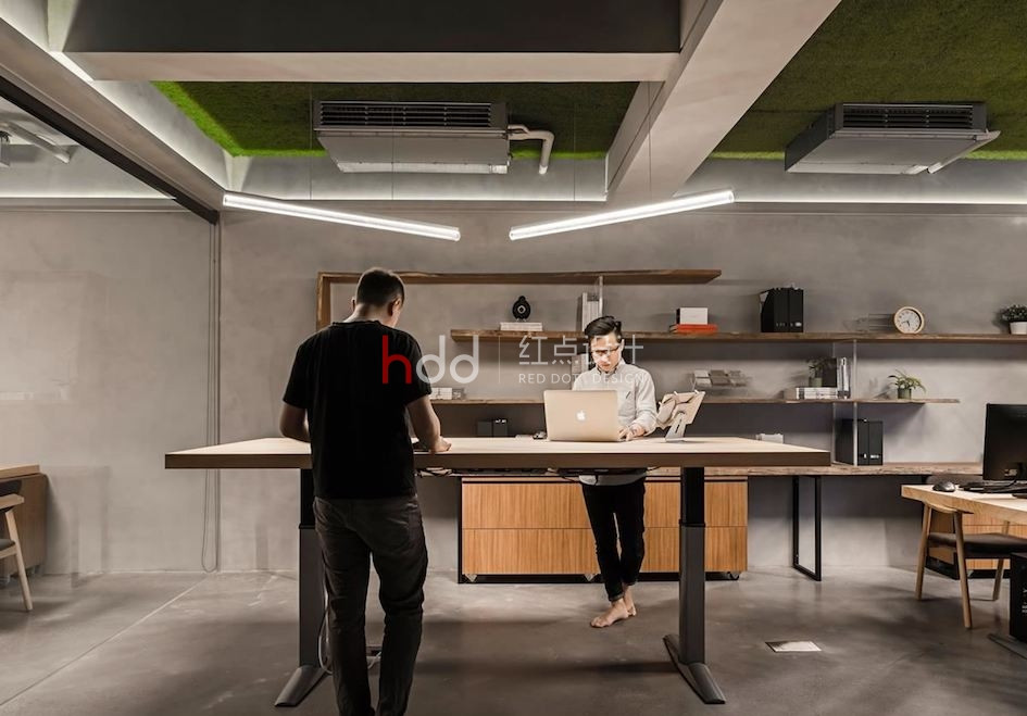 設計團隊的辦公室囊括了 3 層樓透天,每層樓皆以彰顯不同的空間機能為目的,不同于 1 樓以展示為主的現代風格, 2 樓辦公室以個性工業風為主軸。 穿越設計團隊訂制的鐵件垂直樓梯來到 2 樓空間,利用玻璃材質作為隔間,與兩幅雙面落地玻璃窗相互呼應,彰顯整棟建筑的感光度與透明感。雖然空調設備與梁體結構皆為裸露設計,設計師仍悉心透過梁間的燈光安排,佐以梁上的溝槽設計,達到修飾梁面的效果。利用天花板的綠化草皮,柔化水泥粉光地坪帶來的冷調氣息。全開放辦公室內擺放可升降的木質長桌,更能隨辦公、會議調整用途,主管辦公室採用玻璃隔間,同時保有私人空間,卻不顯過度隔閡。