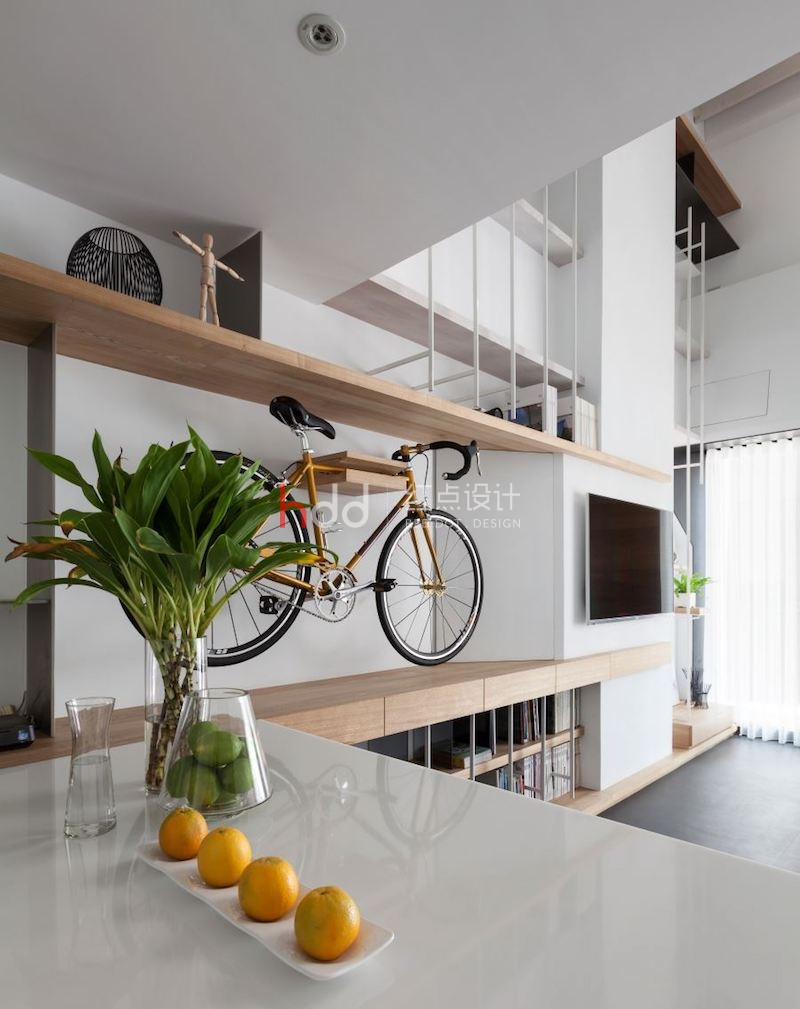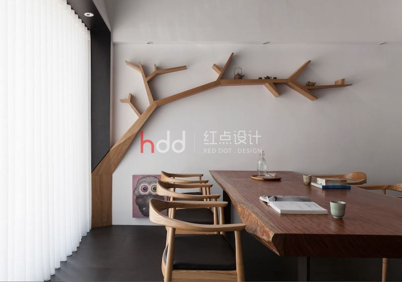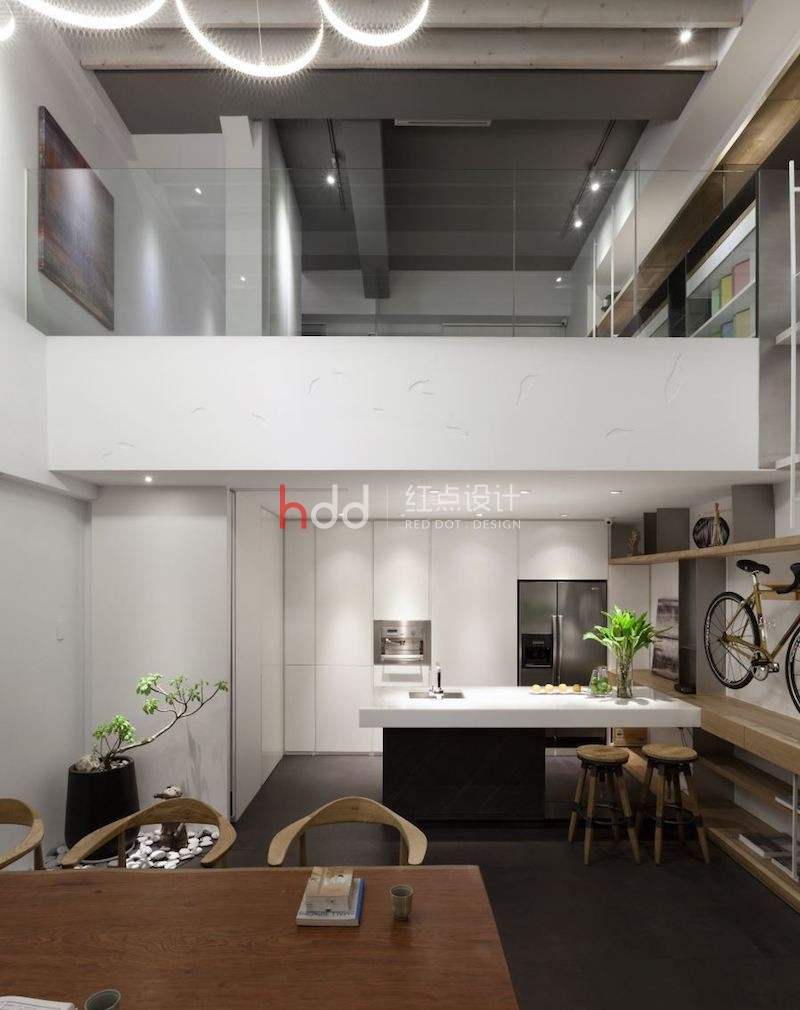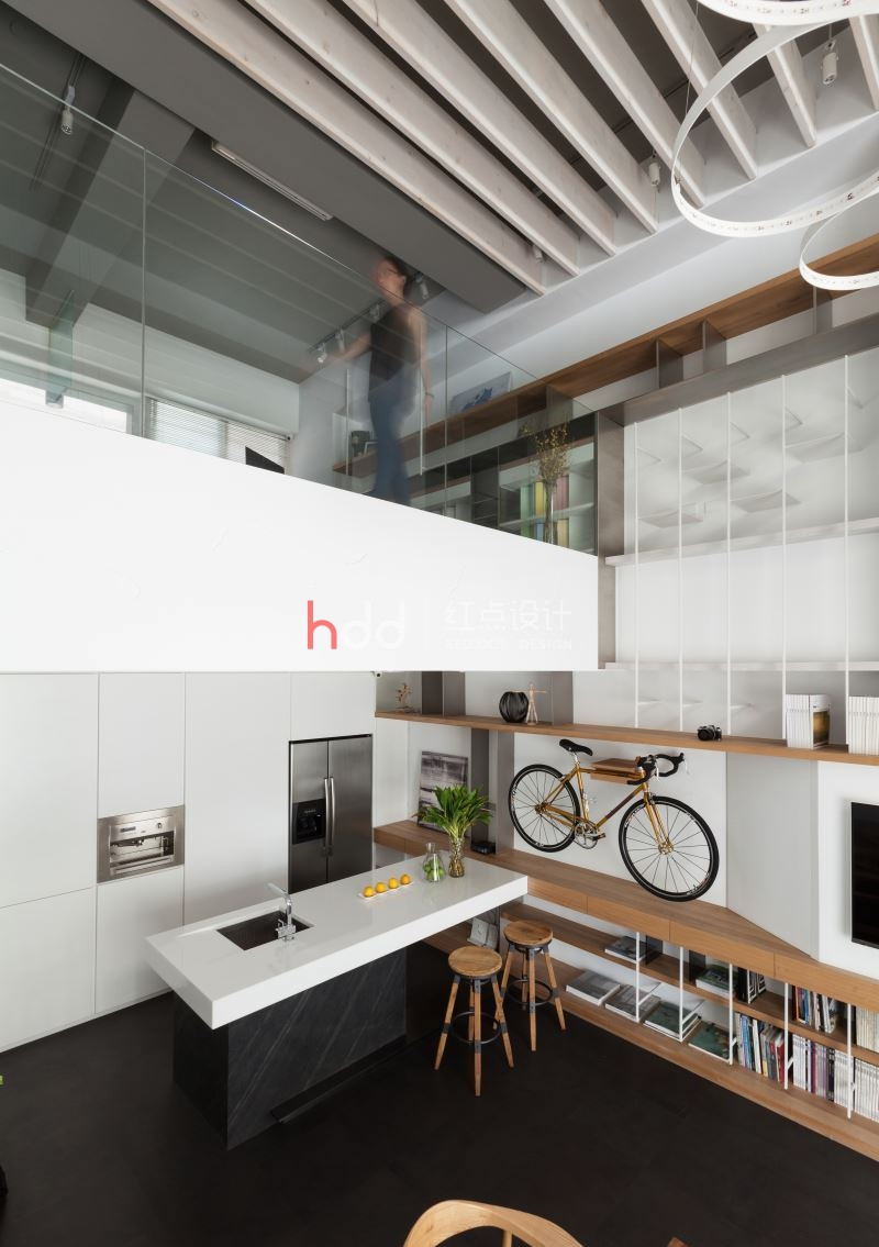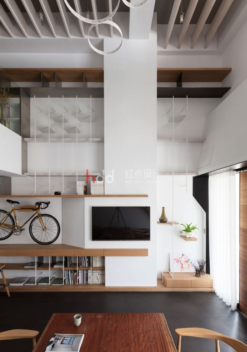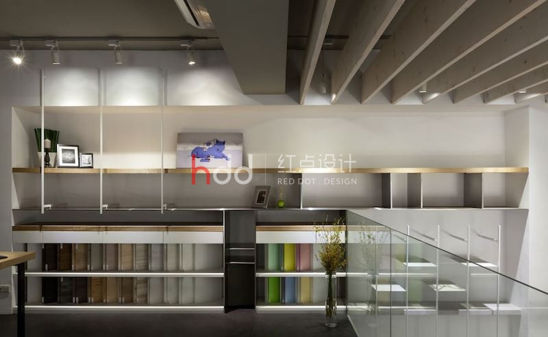 利用復層堆疊延伸尺度,富含更多樣化的想像可能,開放式空間解構格局的限制,輔以透光窗帶進的明亮光照,在車水馬龍的市區中,開拓一處溫煦、休閑的靈感沃土。 紅點建筑+室內設計的辦公室,以白色作為舒適氛圍的基底,在清爽、明晰中,加入適度的木元素妝點,增添溫潤悠閑的特質。整體空間利用開放式設計,包納辦公、會客及建材展示的多重機能性,并延伸中島、洽談,和夾層處的辦公桌,一旁的墻面納入收納展示機能,結合鐵件和木作,相互交錯的層板、線條,延伸至二樓,形成獨特的端景墻,而挑空設計不僅放大了視野,也允許了不同視角的駐足、觀賞,讓靈感也能隨著開闊的視域,更加自由靈活不受局限。