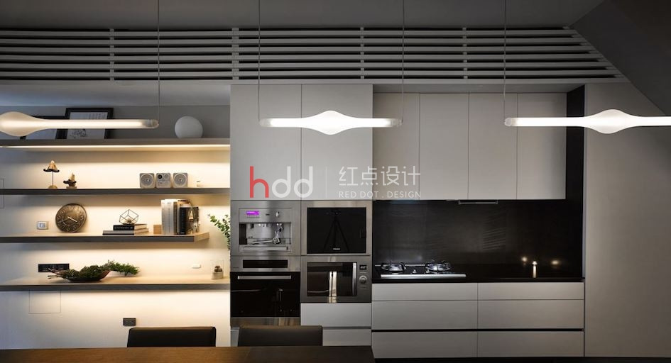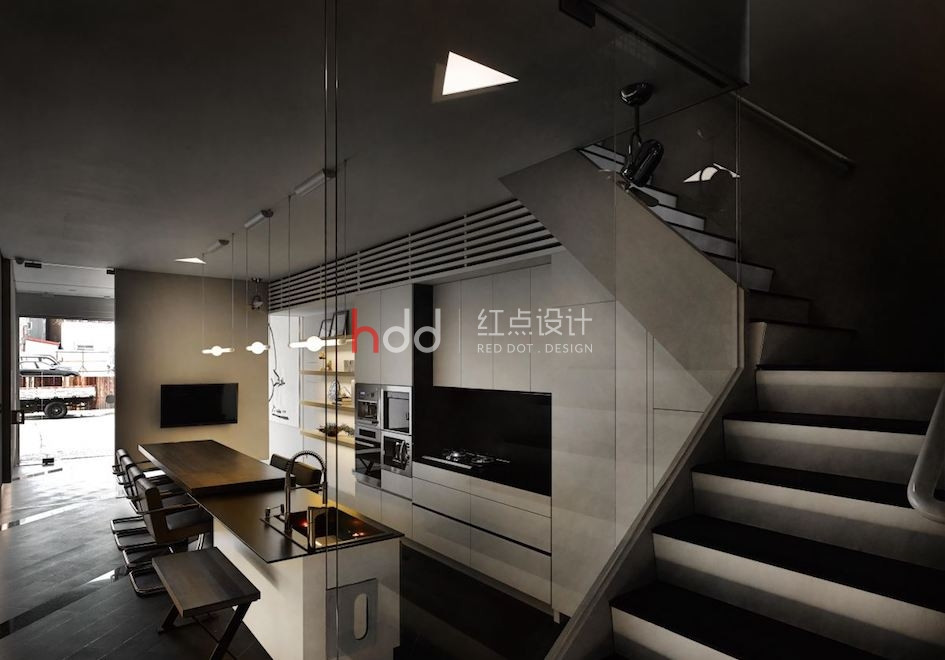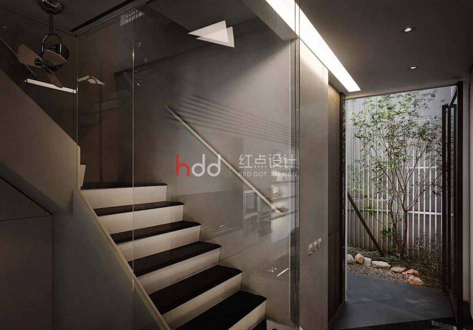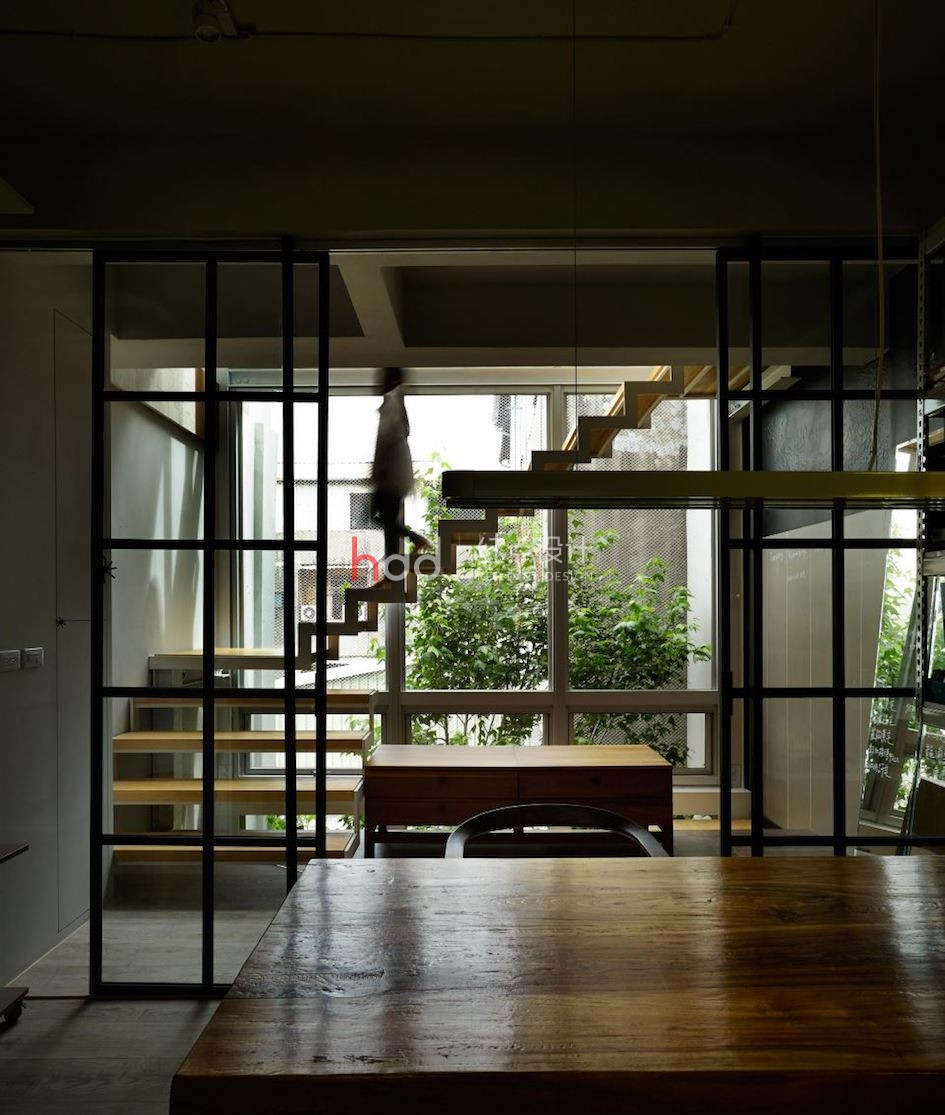 位于一整排房屋中段的透天厝,原本室內(nèi)采光不佳,在設(shè)計(jì)師的改造下,透過(guò)前后的落地窗引注陽(yáng)光,并在后院種植楓香樹,將設(shè)計(jì)辦公室與大自然的溫度嵌合連結(jié),成為讓令人驚艷的社區(qū)地景。 來(lái)到這個(gè)獨(dú)特設(shè)計(jì)的辦公室,以純白為色彩主調(diào),加入造型鐵件、玻璃等介質(zhì),在有序的工作空間中,將光線的進(jìn)折,醞釀為藝術(shù)般的美好表現(xiàn)。從二樓處向上俯瞰,水泥量體和玻璃的幾何層次,于高挑的立面中虛實(shí)交迭,將樓層間連貫為一座自然光井,除了讓視覺顯得通透,空氣也可借此形成上下對(duì)流循環(huán)。通往三樓、四樓的階梯,倚著窗景綠意向上延伸,透過(guò)通透的玻璃介質(zhì),將原本封閉的梯間,則轉(zhuǎn)化為開放式的生活風(fēng)景,一年四季為工作空間帶來(lái)不同的景致變化,與陽(yáng)光、綠意、微風(fēng)完美共生。 陽(yáng)光自透明落地窗透入室內(nèi),仿佛伸手即可觸碰到窗邊的鮮活綠意,而隨著工作中的動(dòng)態(tài)行走,也串連成一幅在樹梢間自在漫步的浪漫畫面。