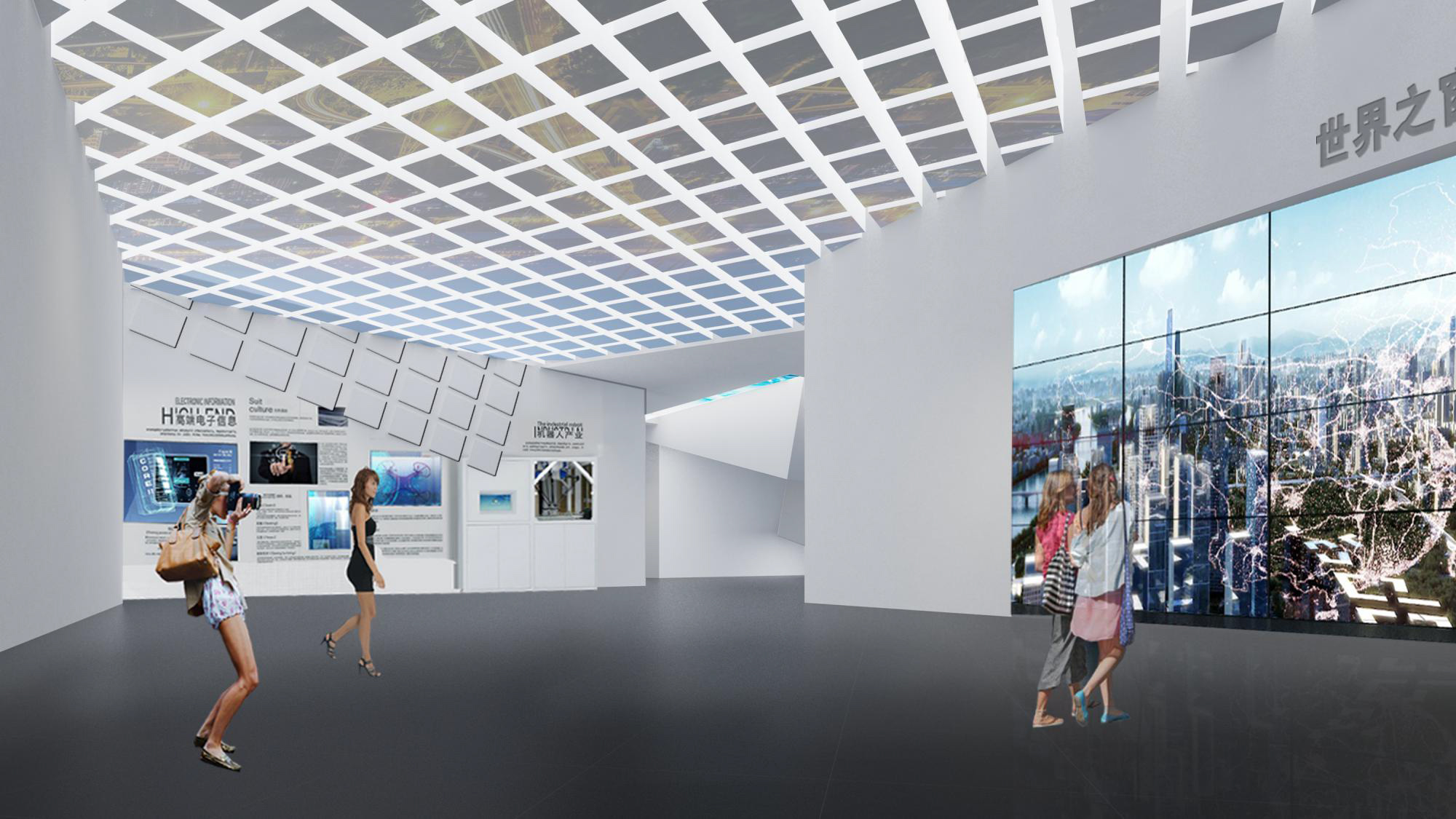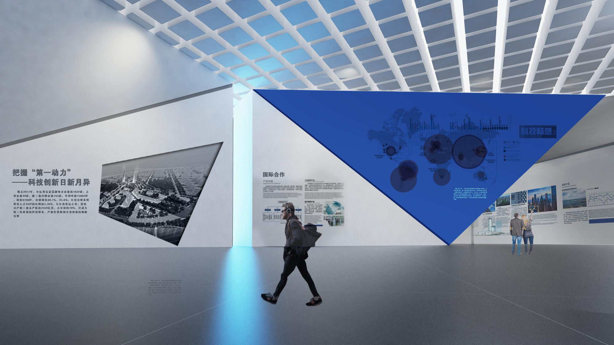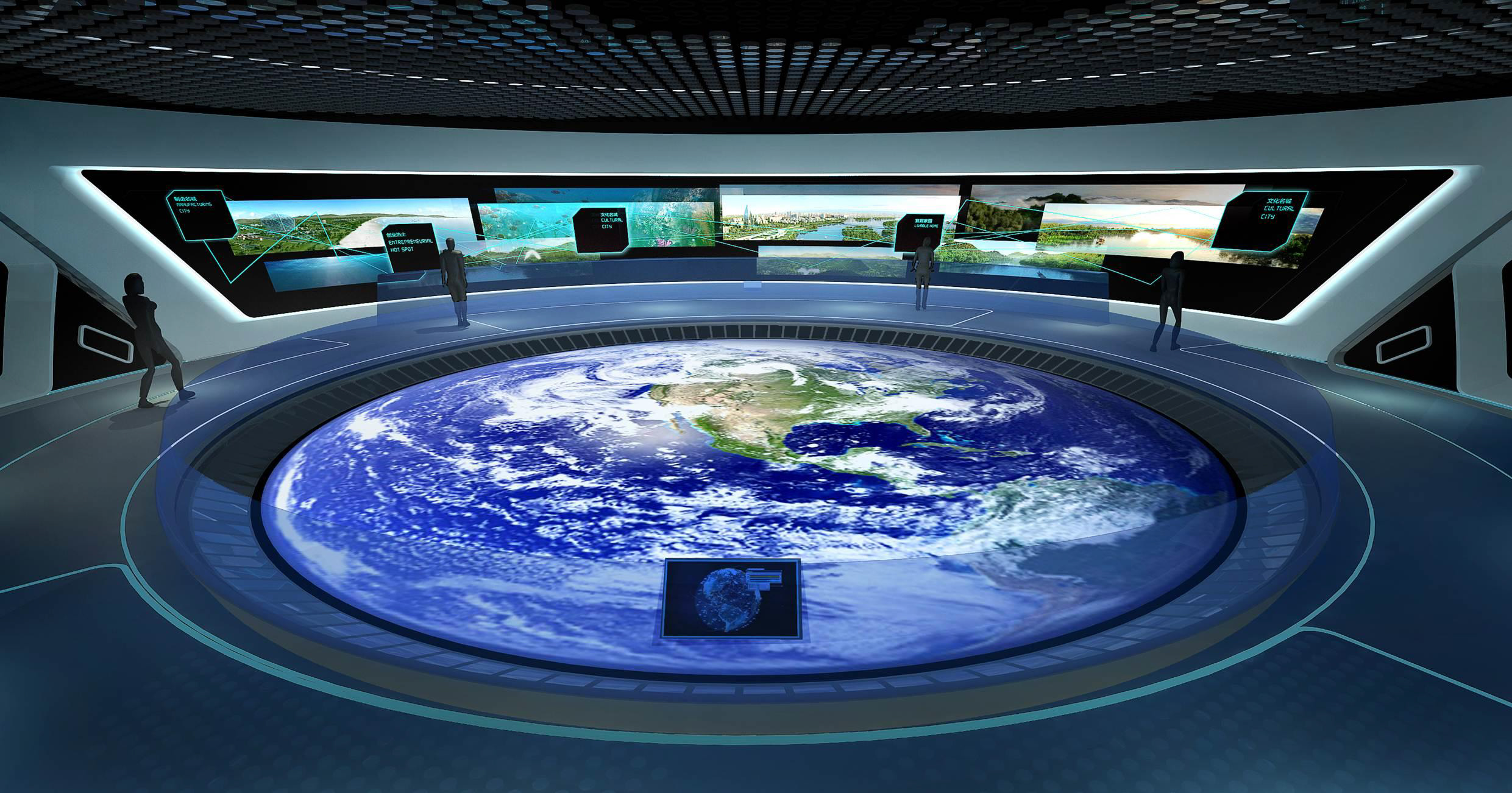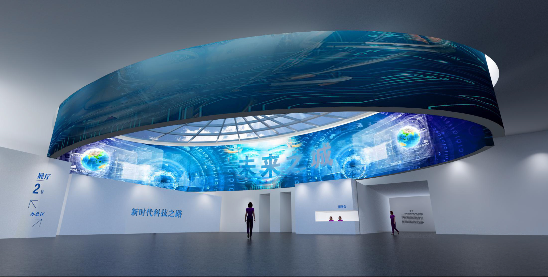 充分考慮建筑現(xiàn)有條件,同時結(jié)合內(nèi)容主題特點,使形式設(shè)計不是強加給建筑,而是建筑的合理延續(xù),本展覽內(nèi)容是科技與未來主題特征,所以設(shè)計追求超時空已經(jīng),利用科技 手段如大型LED環(huán)形屏幕演示主題內(nèi)容。觀眾進入展廳猶如進入一個未來時空,在這個時空之中我們可以看到未來科技的應用,未來新區(qū)的發(fā)展,未來世界的樣子,一個未來的理 想之城以科技手段幻化成為現(xiàn)實。