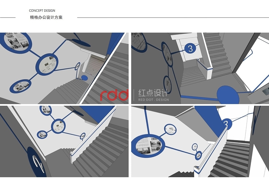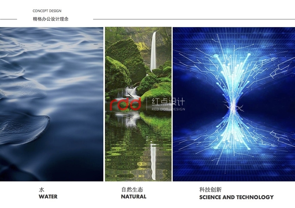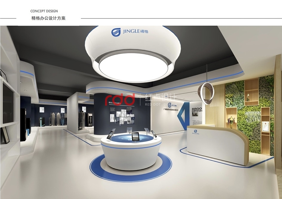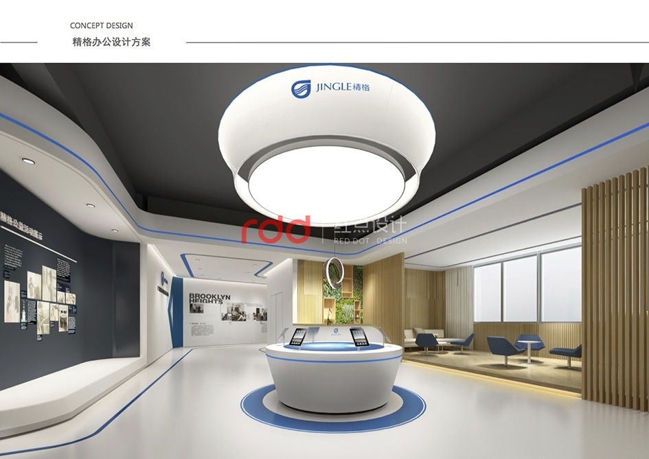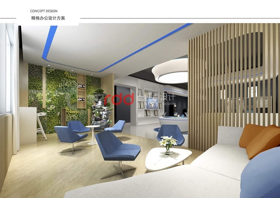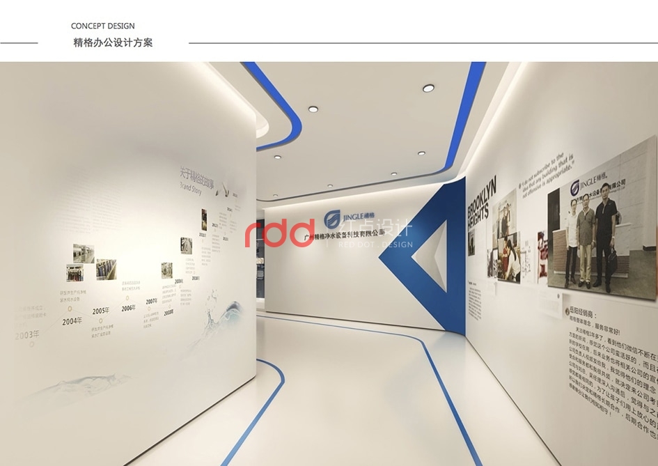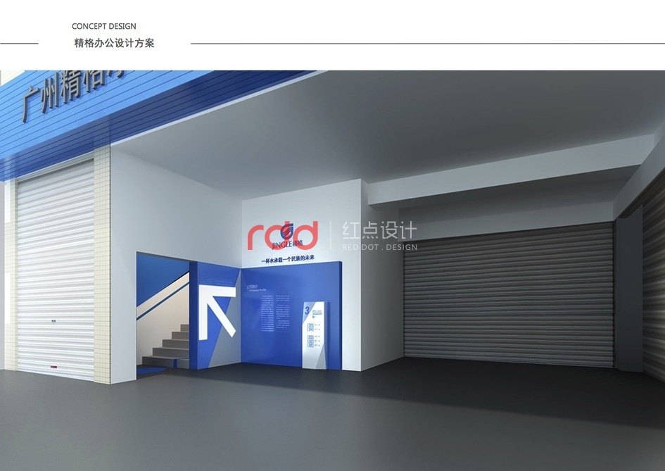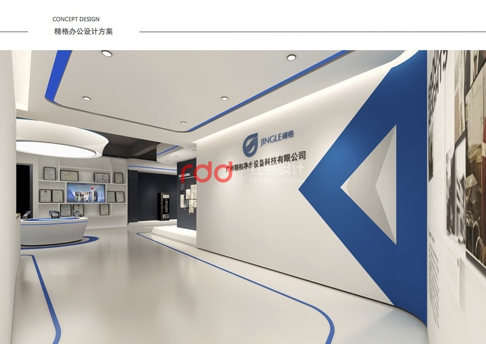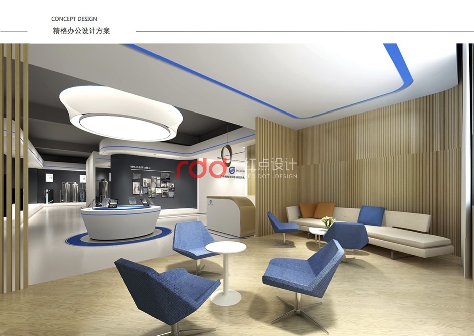 本案是一家凈水設(shè)備公司,因為位置的關(guān)系,所以入口有點特殊,因此紅點裝飾的設(shè)計師為了讓入口處更顯眼,進門處運用大片藍色形象背景墻,“精格”的LOGO及“一杯水承載一個民族的未來”logo標語非常醒目。