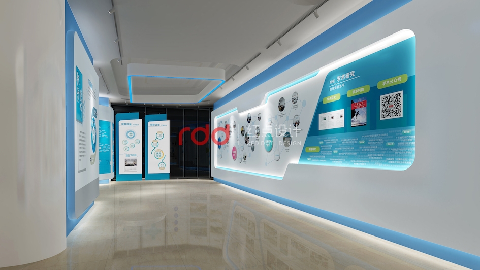 順著流線往里面走去,兩邊藍白相互輝映的造型墻正向參觀者講述著企業(yè)的過去與未來。仿佛徜徉在企業(yè)的海洋,述說著一個個精彩的歷史故事。