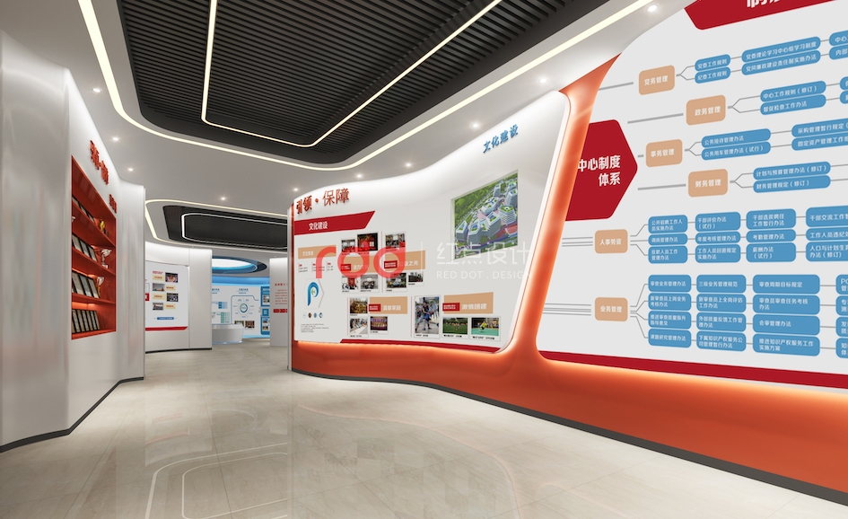 “百舸爭流奮楫著先,千帆競發(fā)勇進著勝?!笔钱斍爸R產(chǎn)權(quán)事業(yè)的發(fā)展狀態(tài)。根據(jù)這樣的發(fā)展趨勢,紅點裝飾的設(shè)計師按照客戶的需求,總結(jié)出本次展廳的新理念:開放包容、務(wù)實高效、公平公正。